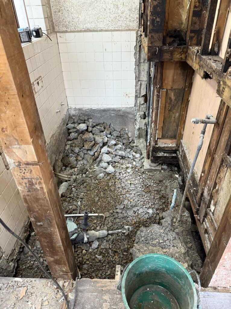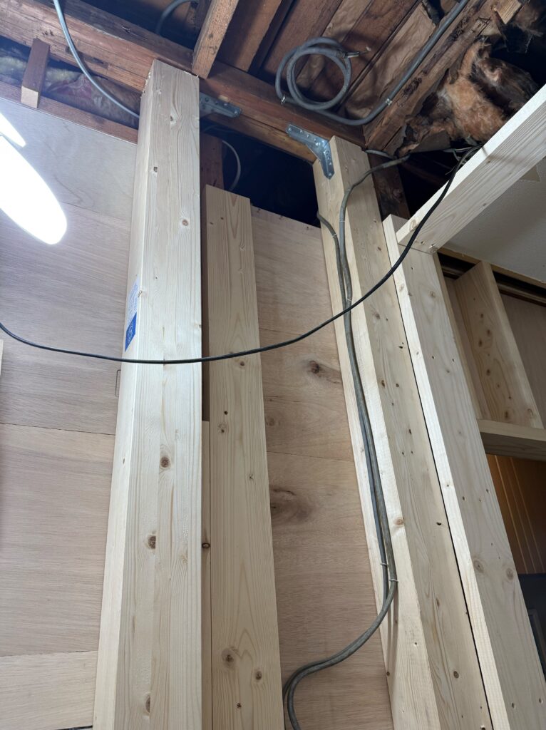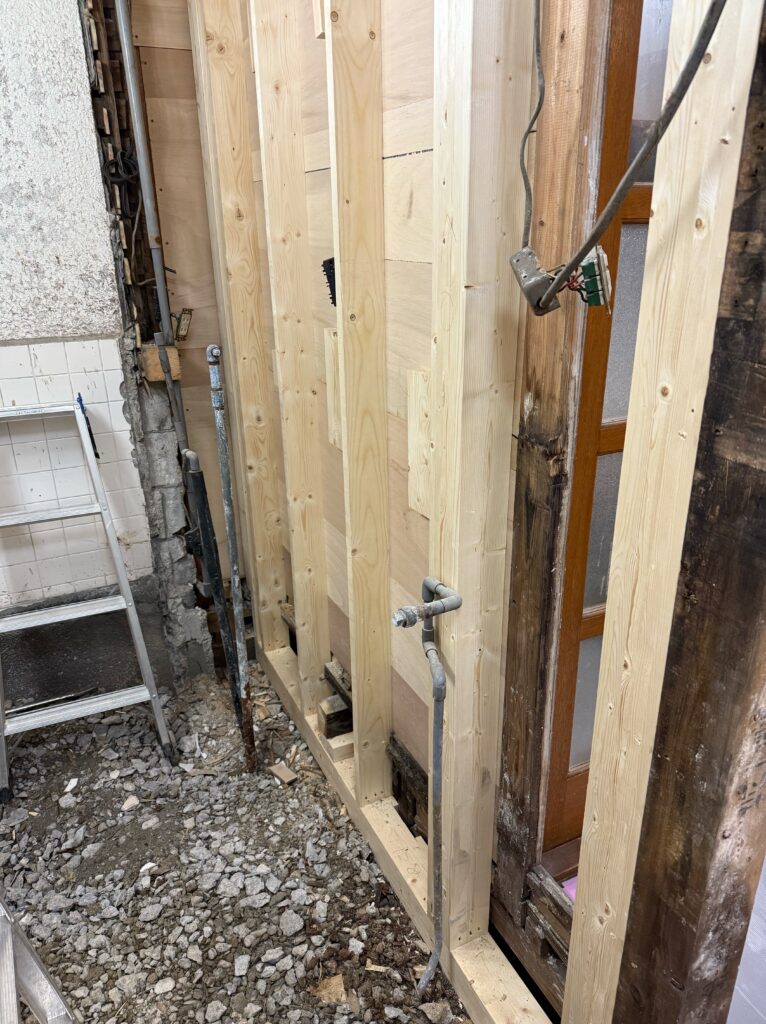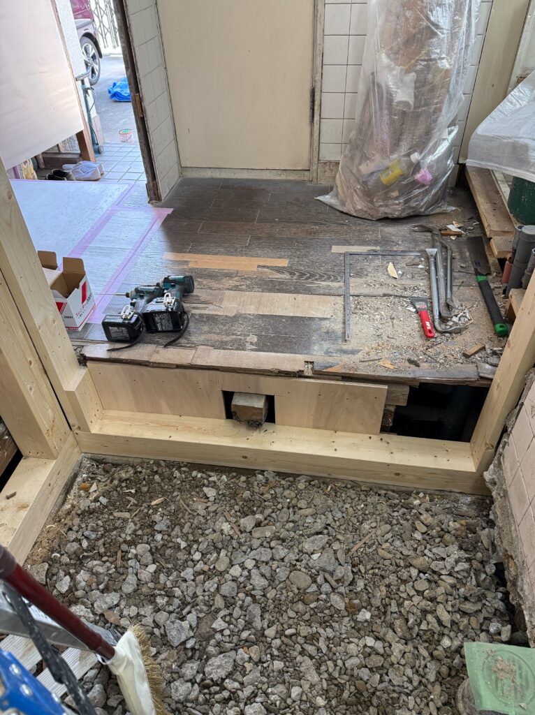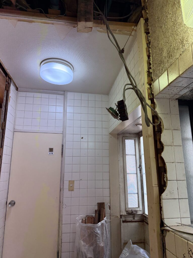 ギャラリー GALLERY ホーム ギャラリー 【練馬区 H様邸】洗面所・お風呂改修工事 2025.11.12 【練馬区 H様邸】洗面所・お風呂改修工事 2階のトイレ配管から水漏れ 壁や柱、断熱材にも水が回り異臭とカビが発生 腐った柱や土台を交換 浴室にコンクリートを流しました。 耐震金物で補強 耐震金物を施工 リビング側の壁を改修 リビング壁改修後にエアコンの交換工事 容量の小さかった分電盤も今回交換しました。 洗面所入口はクローザー付きの引戸アウトセットを設置 一覧へ戻る