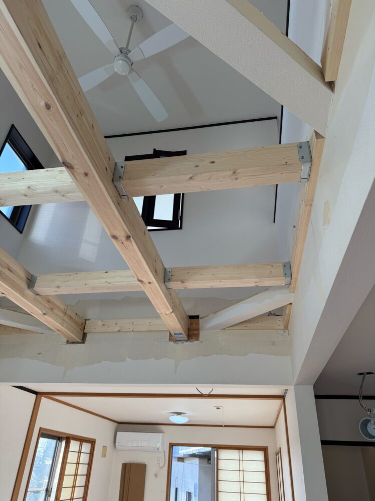 一部壁を壊し梁を渡す作業