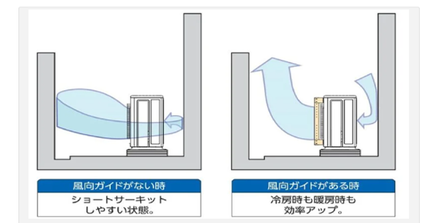風向板を設置する事で室外機から出た温風を上部に向かって排出する事が出来て