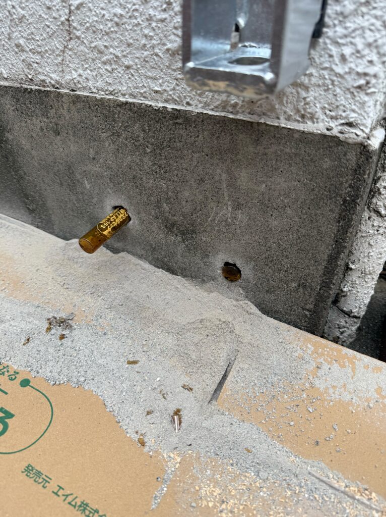 基礎部分には径の小さい穴をあけ強力接着剤を打込みます。